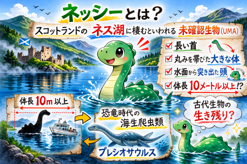 ネッシーとは、スコットランドにあるネス湖に棲むといわれている未確認生物(UMA)のことです。