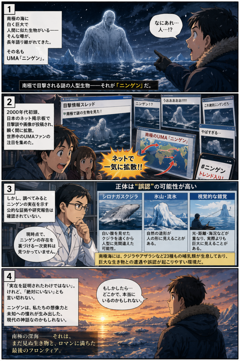 南極のUMA「ニンゲン」を改めて整理すると、次のようになる。