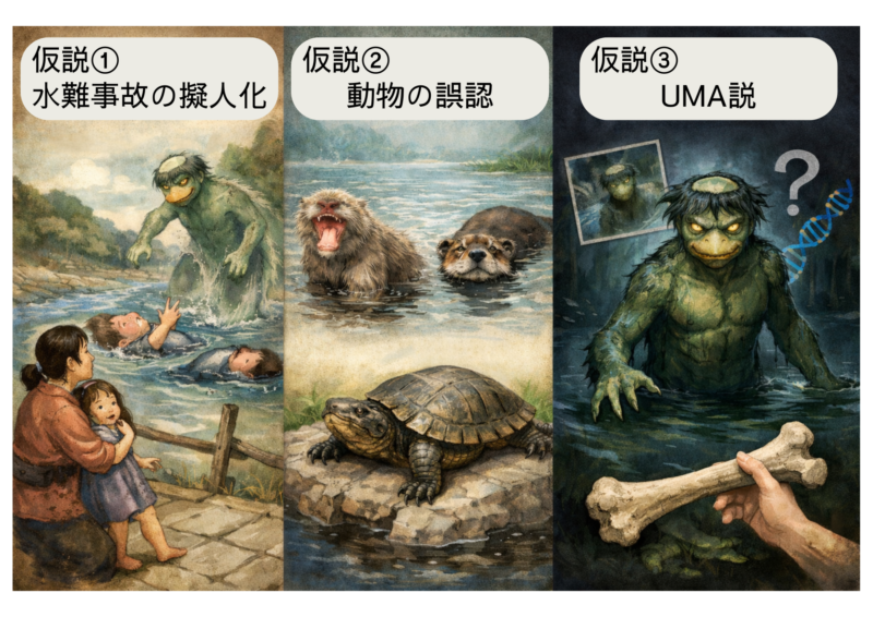 - 正体として最有力なのは「水難事故の擬人化説」(民俗学的に高く評価)